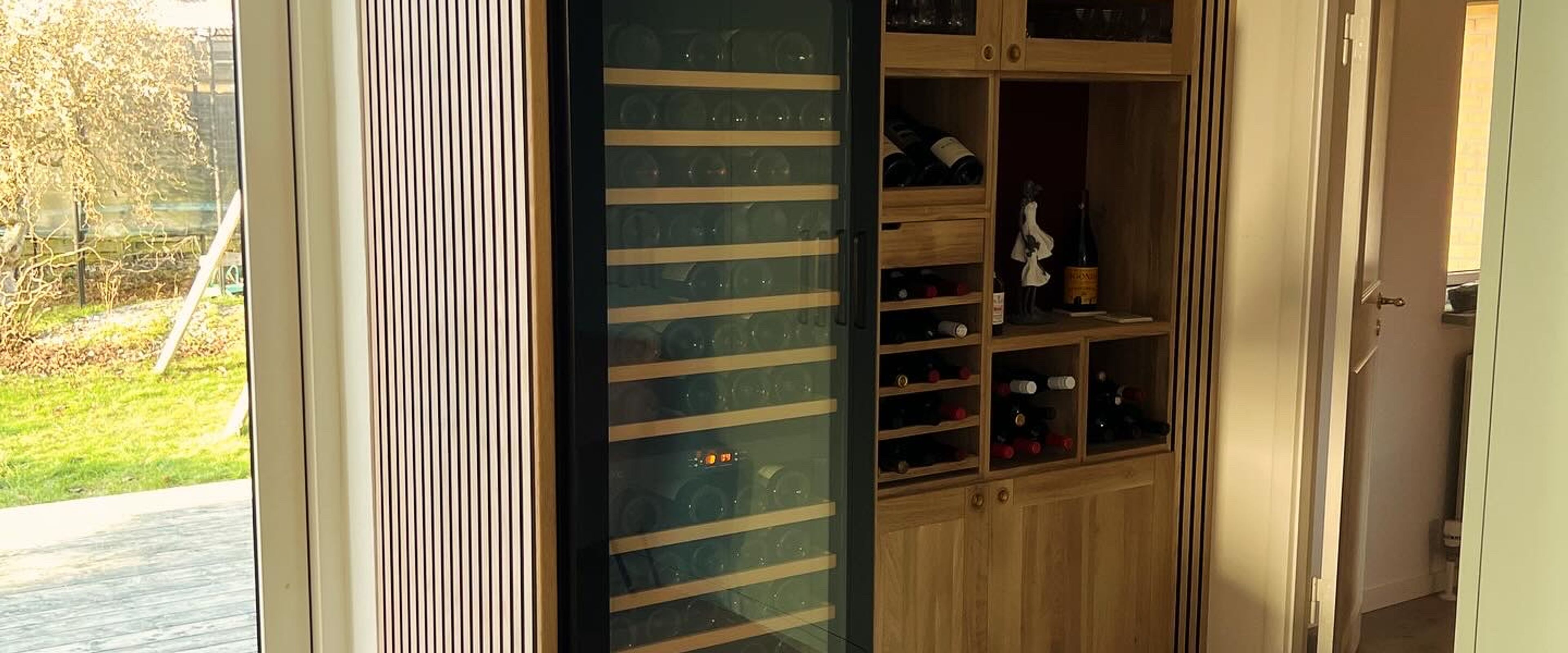 Die Regale lassen sich leicht zu einer ganzen Weinwand ausbauen. In Kombination mit einem ausgezeichneten Weinkühlschrank des dänischen Herstellers Pevino, mit Platz für 141 Flaschen, aufgeteilt in 2 Zonen, wurde der Traum von der Weininstallation Wirklichkeit.